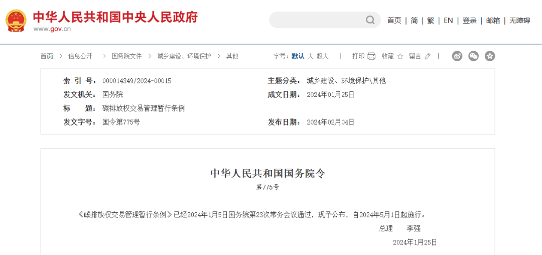 《碳排放權交易管理暫行條例》已經2024年1月5日國務院第23次常務會議通過,現予公布,自2024年5月1日起施行。